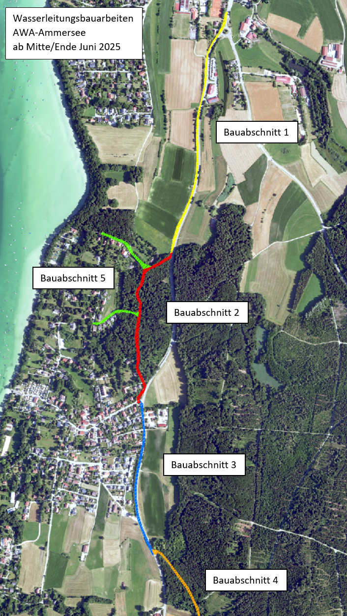 Im Auftrag der AWA-Ammersee gKU wird die Firma Richard Schulz aus Gilching ab Mitte/Ende Juni 2025 vom Kreisverkehr in Inning bis zum Schlagenhofer Buchet, südlich des Ortsteils Buch, eine neue Wasserleitung verlegen sowie in der Waldstraße und Seeblick die vorhandenen Wasserleitungen erneuern (siehe Skizze unten). Die Maßnahme dient der Anbindung eines neu zu errichtenden Hochbehälters im Schlagenhofer Buchet sowie der hydraulischen Anpassung zur Verbesserung des Brandschutzes in den Ortsteilen Inning und Buch.