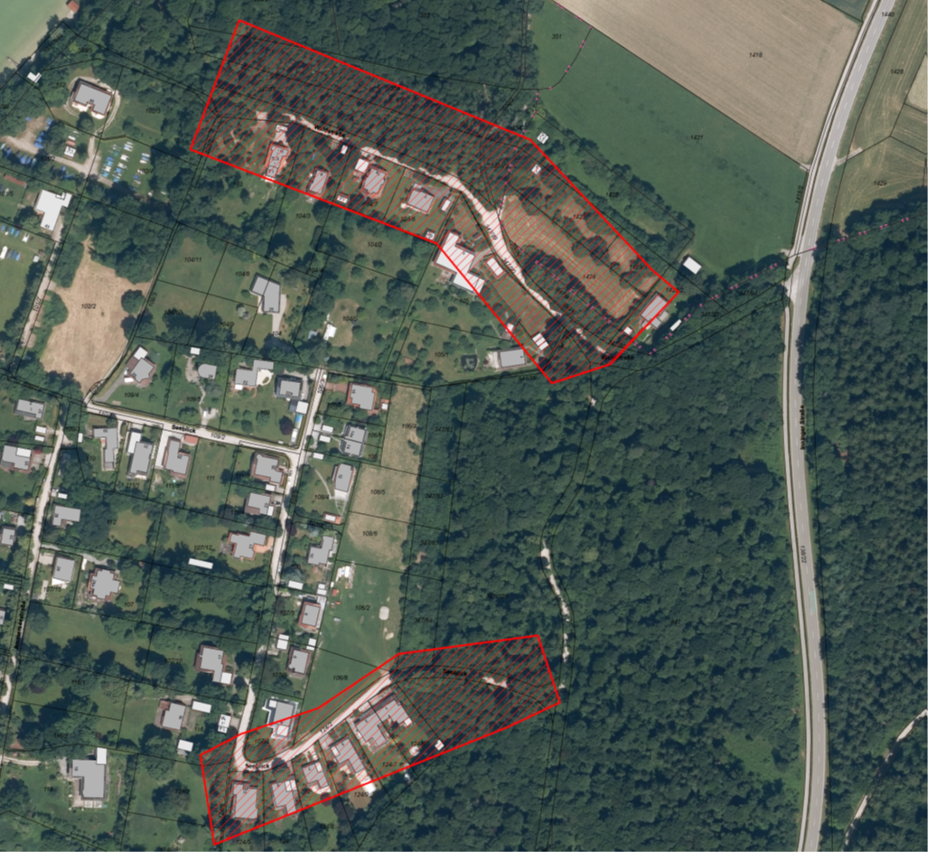 Anschließend erfolgt die Verlegung zunächst im Bereich Waldstraße / Am Vorholz nach Süden (roter Bereich), dann im Bankett der St2069 mit halbseitiger Sperrung und ggf. Ampelschaltung bis zur Einfahrt in den Schlagenhofer Buchet (blauer Bereich).